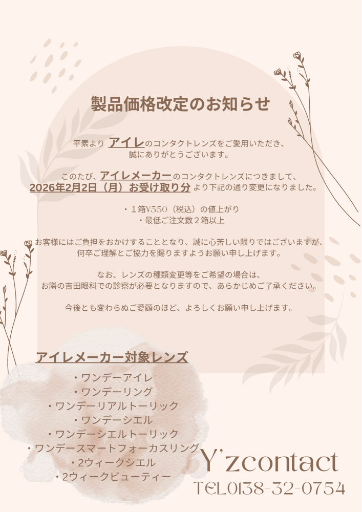アイレのコンタクトレンズ、全商品が値上がりとなります。