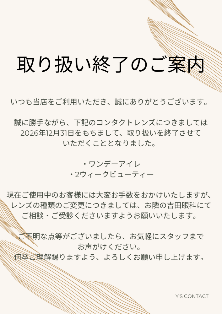 このたび、アイレのコンタクトレンズにつきまして、料金改定および一部商品の販売終了が決定しましたので、下記の通りご案内いたします。